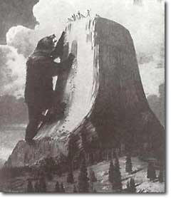Long before America was stumbled upon by the rest of the world, Devils Tower had many different names and was a place of worship for the Native Americans. Some of the greatest tribes laid claim and myth to the Tower. The Arapaho, Crow, Cheyenne, Kiowa, Lakota, and Shoshone tribes all maintained a very close relationship with the Tower and they all told their own stories about this wondrous fixture on the western landscape. During this time the Tower had as many myths told about it as it had names. Bear’s House, Bear’s Lair, and Grizzly Bear Lodge are just a few names bestowed upon the Tower by Native Americans. The most popular of these Indian Legends tells a story of 7 Indian girls that were playing when they were approached by a ferocious bear. The girls climbed onto a flat rock, realizing that the bear could easily reach them, they began to pray to Wakan Tanka for help. Their prayers were answered because they were so pure of heart and the flat rock began to rise toward the sky like a tower. As the tower rose into the air, the bear clawed at the rock in hopes of reaching the girls. The tower rose far beyond the reach of the bear and continued to rise until it reached its heavenly point. The girls were transformed into stars and they launched from the tower and became the Big Dipper. The deep horizontal gouges in the rock left behind by the bear and the brilliant Big Dipper that shines in the night, are proof to the Indians that the legend is indisputable.