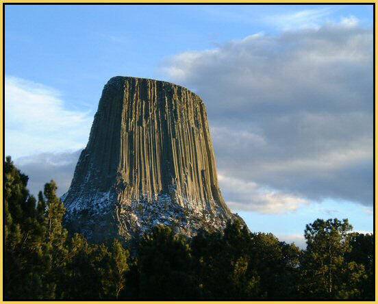 Devils Tower is located in beautiful Wyoming’s northeast corner. This spectacular landmark is a monolith that towers over the Belle Fourche River. The Tower stands 1267 feet above the surrounding terrain and 5112 feet above sea level. Although located in Wyoming, the closest city is Rapid City, South Dakota. Geologists all agree that the Tower was formed by the intrusion of igneous material, and that is about the only thing they agree on. This basic explanation occupied the minds of some of the greatest thinkers through the early 1900’s. Later, it was theorized that Devils Tower was actually a volcanic plug or the neck of an extinct volcano. Some insist it surfaced from the earth, others believe it is what was left by a large ancient explosive volcano. There is even a dispute over the name. Although proper grammar dictates that it is “Devil’s Tower”, it has always been and always will be, “Devils Tower”.