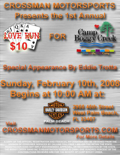 Jenn Crossman, of Crossman Motorsports, is putting together the 1st Annual "Love Run Benefiting Camp Boggy Creek" on Sunday, February 10, 2008. It is a Poker Run that will begin at Harley-Davidson Palm Beach, 2955 45th Street, West Palm Beach. Registration begins at 10:00 AM. An ending BBQ and live music will be at Center Drive, John Prince Park, Lake Worth, Florida. For further information contact linda@crossmanmotorsports.com.