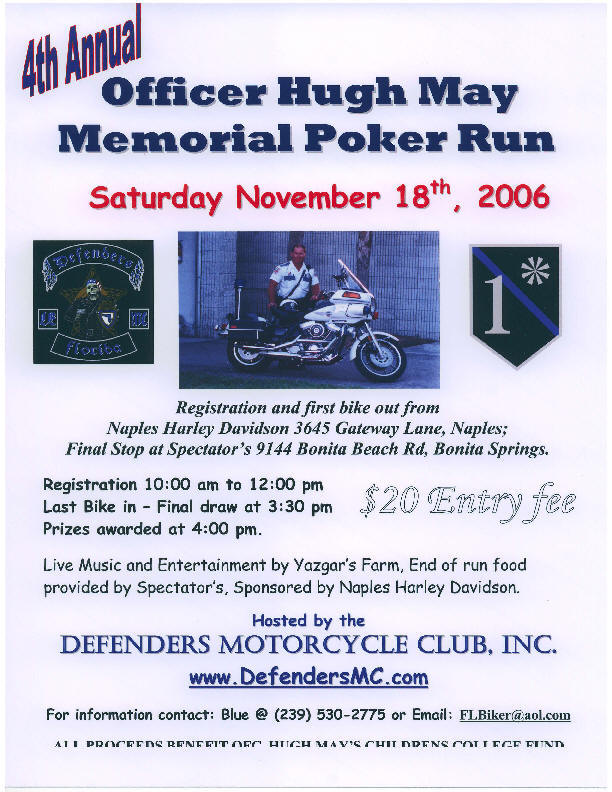 Steelhorse Posse MC will be attending the Hugh May Memorial Poker Run in Naples, Florida which is being hosted by the Defenders MC.