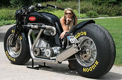 The fuel injected, 45 degree 6728 cc / 410 cubic inch V-Twin runs through a 3 speed transmission with reverse and actually looks pretty good in its finished state compared to the initial photos, in fact, everything looks good. It puts out 523 foot pounds of torque. Seat height is 31.5 inches and overall length is 136 inches. It is a little heavy at 1433 pounds so high speed corner carving might be an issue and there aren't any photos of the big bike on the road so I guess we'll have to wait for the road test, that is if someone can actually road test this monster.